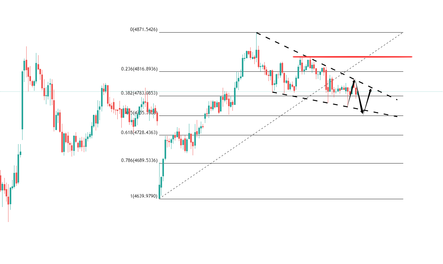 扫盘,是行情目前的特征,考虑到这个因素,买涨打算就必须要接近于核心支撑才行,很多人都跟我说4740很关键,它也是周内跳空的一个回补缺口,但我认为最关键的是4753,从4644开涨到4870后的回撤比例支撑就在这,不仅如此,它还是整个内敛三角形整理的末端底部价格,我没有理由不在这里去买入尝试,给到就做,当然防守还是要做的,给到4740即可,多一毛都不给,我也害怕触发黑色星期五暴跌。