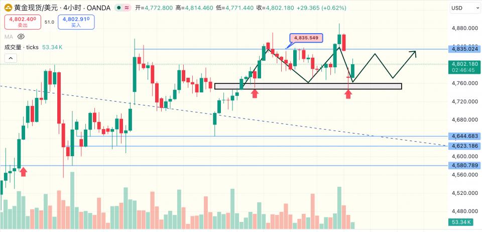 不过,价格随后快速回升并重新站上4800上方。在尚未完全回补跳空缺口的情况下,盘面存在技术性修复、窄幅反弹的可能。