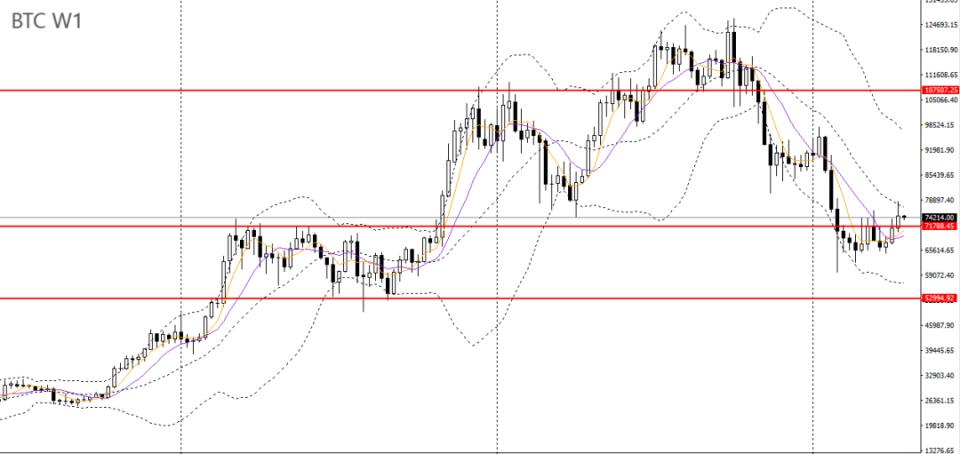 比特币上周延续反弹,RSI进一步回升,波段空头动能放缓,有望继续反弹。昨日小幅收跌,刺破10日均线,76000附近面临强压,下方首先关注74000一线支撑,如出现企稳,后市有望重新走高,如彻底下破,短线预计将回踩70000附近。