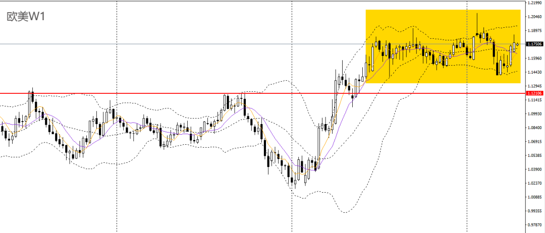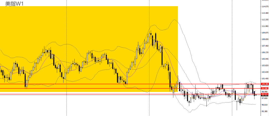 美元指数上周再收长阴线,下破周线布林中轨,波段预计将延续低位震荡。周五金针探底,4小时守住97.50一线支撑,再度站上98大关,上方继续关注98.50附近阻力,如无法升破,后市预计仍将维持低位震荡。