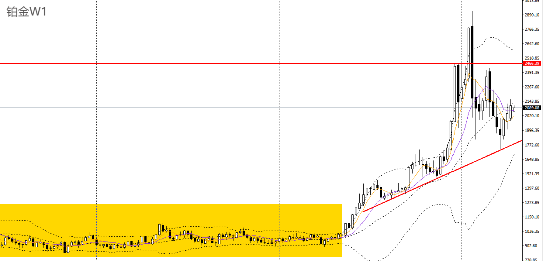 铂金上周延续上行,RSI位于50上方,波段预计将维持高位震荡格局。周五持平前高,日线RSI位于50之上,4小时于2150附近受阻,如继续承压于下方,多单可暂时离场。