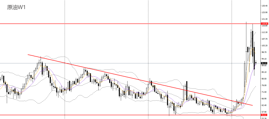 美原油上周继续重幅下挫,刺破10周均线,波段多头力量减弱。周五深度回落,承压于5日均线,4小时一度刺破85一线支撑,92下方可维持高空思路,后市大概率将延续震荡下行。