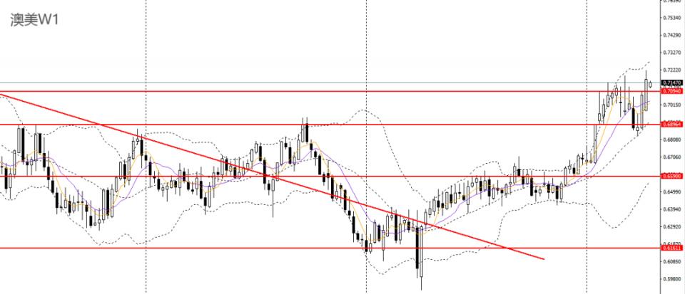 澳美上周强势拉升,刺破前高,波段趋势继续看多为主。周五收倒锤阳线,今日亚盘跳空下行,随后修复跌势,如于0.7140附近企稳可进多,后市有望再度上探0.72-0.7220。