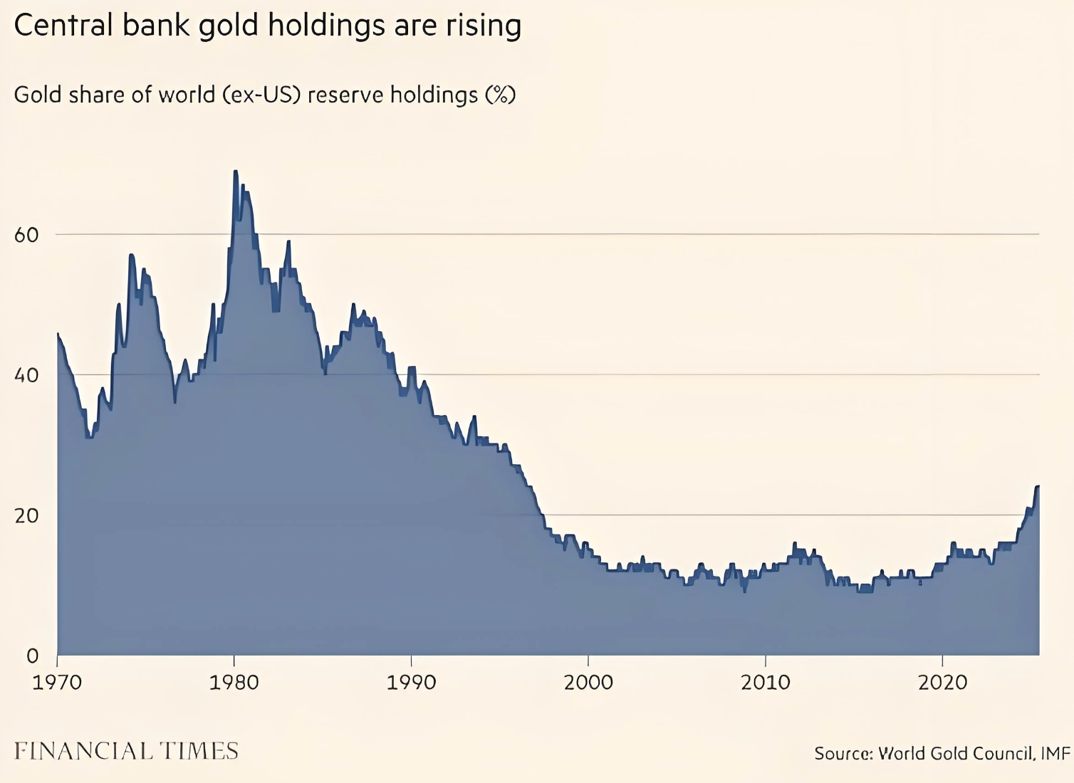 1980年,在沃尔克大幅加息、强势美元政策下,黄金在(不包括美国)全球央行储备中的占比达到历史顶峰(约60%左右)。当时高通胀推动黄金大涨,随后被强势美元和紧缩政策“挤出”金融体系,黄金份额长期下滑。