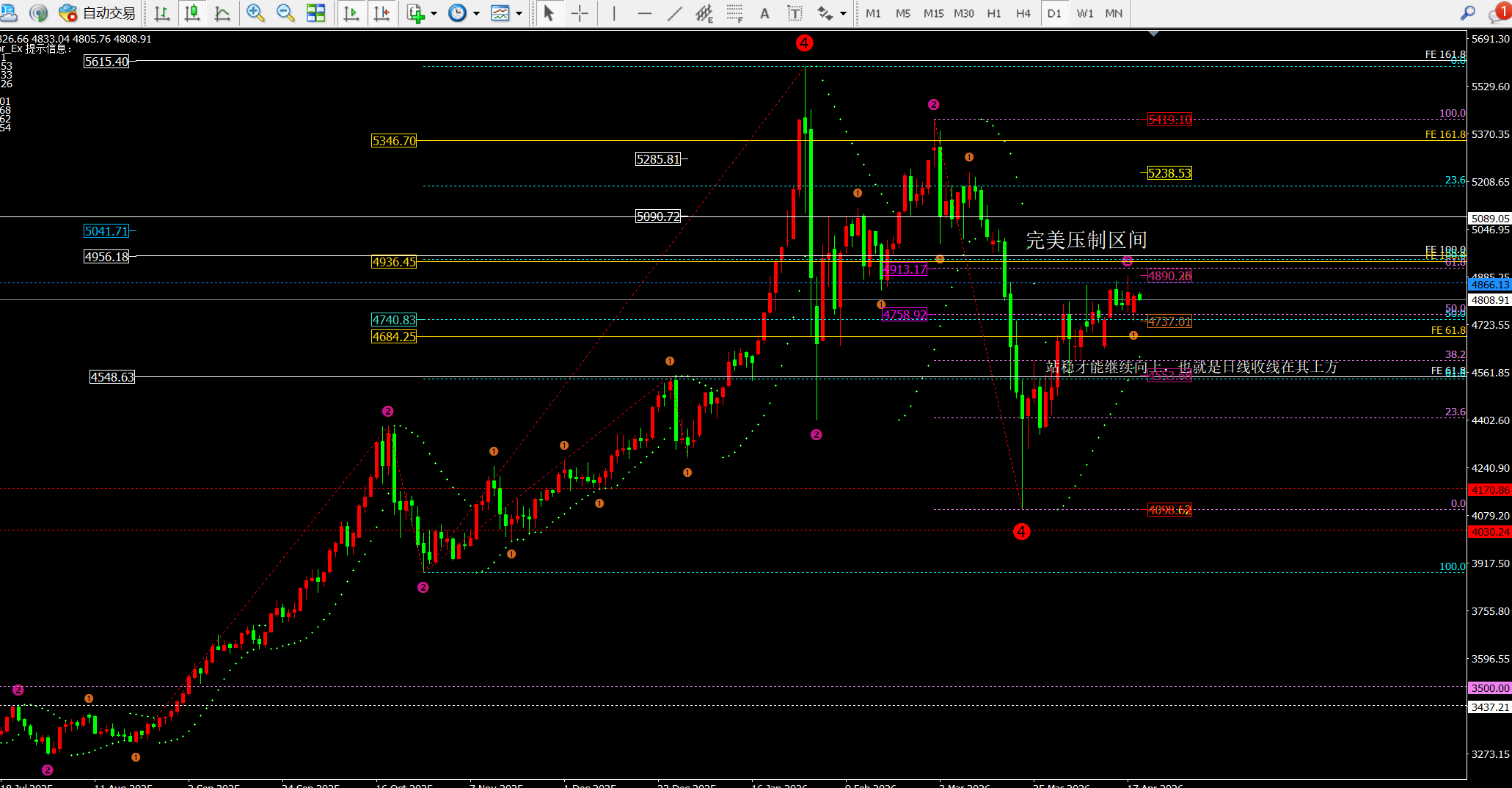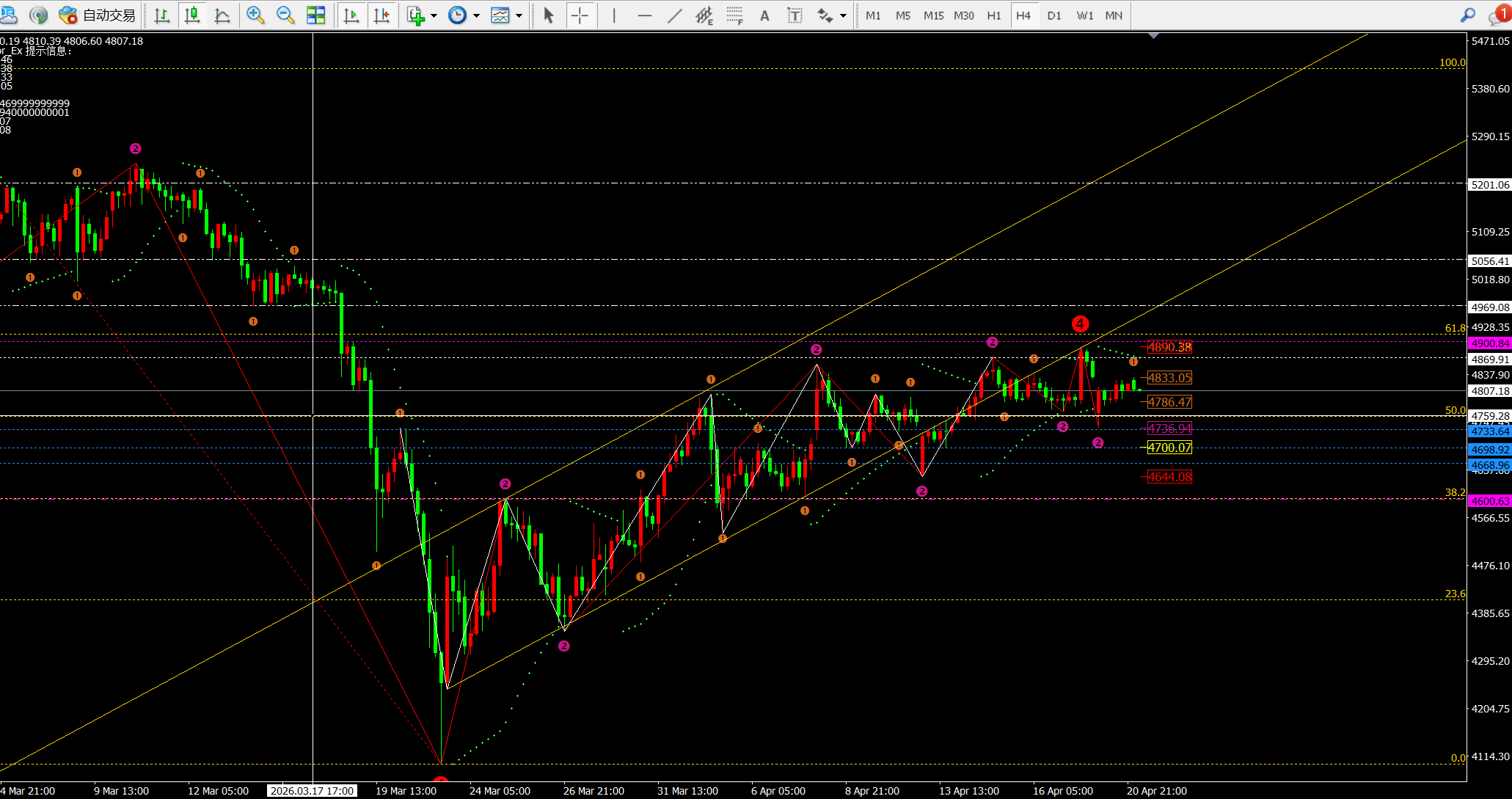 从日线来讲:日内不会跌破昨日低点,那么4751上方就是我们布局多单的最佳点位,以及目前的4786附近。至于均线MA5附近4909一线先看情况。