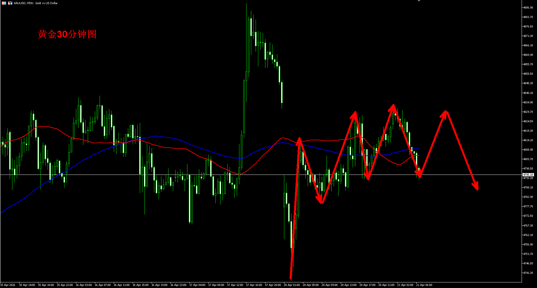 黄金4小时还是大区间震荡,黄金30分钟回补好缺口之后开始走弱,短期黄金如果继续跌破4780区域支撑,那么黄金可能还将继续下跌,黄金午后反弹还是继续空,上方继续关注4830区域阻力压制继续高空为主。