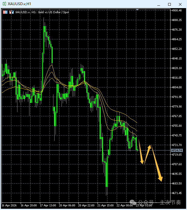 一句话看懂黄金Gold:巨震之后缓步下行,小时图均线系统压制,这是二次下探的节奏。
