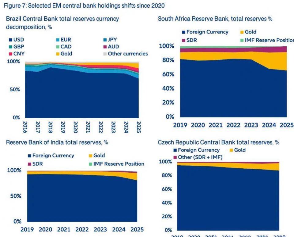全球外汇储备结构,正在发生一场悄无声息但意义深远的变化。以巴西、南非为代表的新兴市场央行,正逐步降低对美元资产的依赖,同时提升黄金在储备中的占比。这种调整并非短期策略,而更像是一种长期的资产再配置逻辑——在不确定性持续放大的全球环境中,单一依赖美元的风险正在被重新评估。