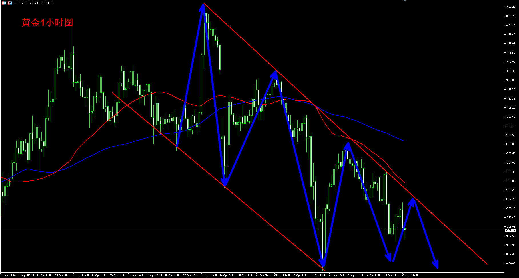 黄金1小时整体还是在下行通道中保持震荡下行的走势,短期还将弱势延续,黄金当前阻力压制已经下移到4720-4730区域,黄金美盘如果反弹到这个区域,那么还是可以继续高空为主,即使有消息的配合上涨,那么黄金短期也还是继续进入大区间的震荡,很难直接反转,所以不要轻易追多。