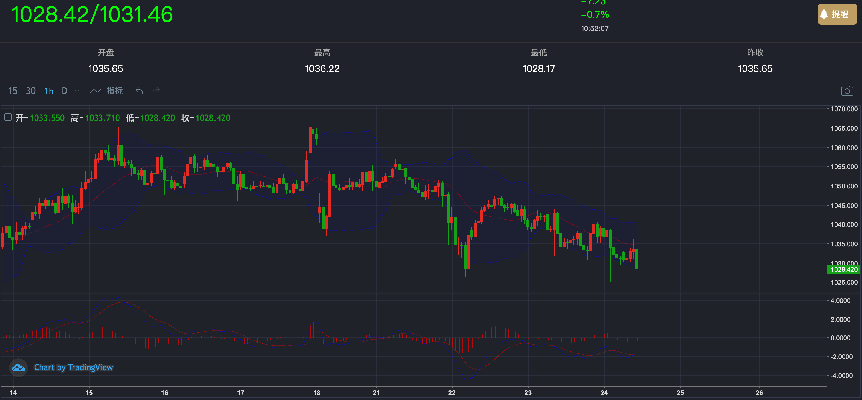 从当前1小时线来看,行情整体呈现出震荡下行格局,高点持续下移,反弹力度逐步减弱。此前冲高至1060上方后未能延续,多次回落形成明显的下降节奏,说明上方抛压逐渐增强,市场重心正在下移。