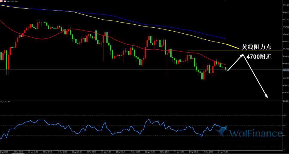 技术面跌破均线支撑,空头趋势强化:当前金价跌破红黄蓝三均线支撑,图表明确标注黄线阻力点 4700 附近为强阻力,反弹受均线压制明显,空头动能占据主导,需警惕延续下跌风险。