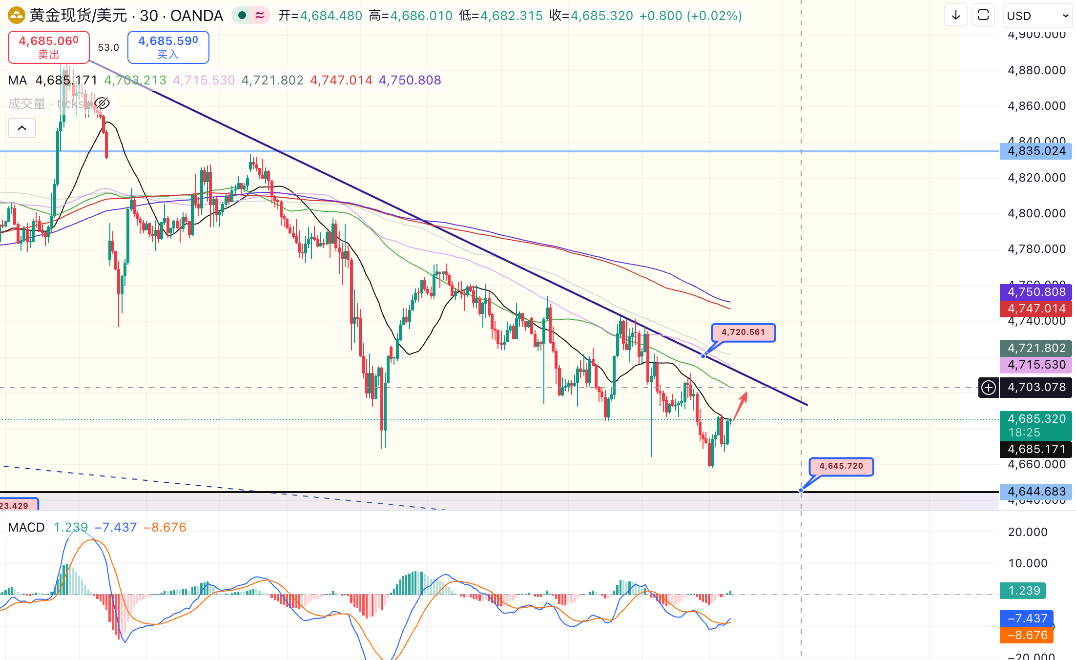 从指标来看,MACD在零轴下方形成回升,红柱动能逐步扩张,多头修复力量正在增强,这通常意味着短线反弹尚未结束。若价格有效突破并站稳 4685,上方进一步测试 4701-4702 的概率将明显提升,而一旦4702被有效站稳,行情有望打开新的反弹空间,上看 4737 一线。