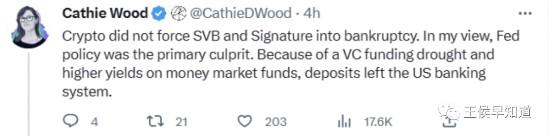 解析:Wood发布了一系列推文,称,“在我看来,美联储的政策是罪魁祸首。由于风投资金短缺和货币市场基金收益率上升,存款离开了美国银行体系。”
