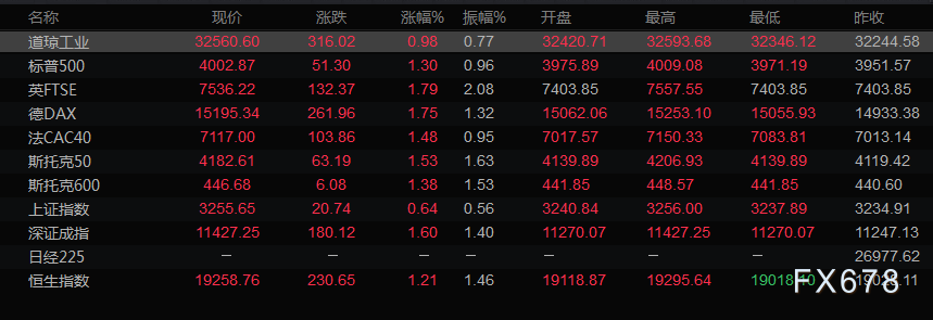 美股收盘情况:道琼斯工业指数上涨0.98%,至32560.6点;标普500指数上涨1.30%,至4002.87点;纳斯达克指数上涨1.58%,至11860.11点。