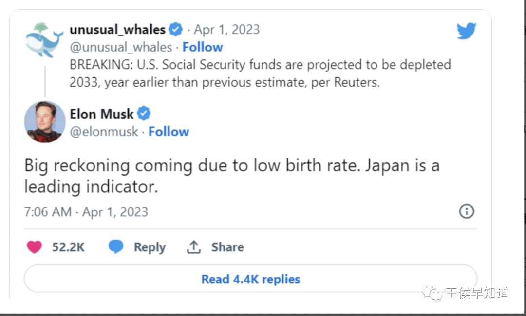 解析:马斯克上周五在推特上表示,美国将尝到出生率下降的苦果,而日本就是前车之鉴。“由于低出生率,大清算即将到来。日本是一个领先指标。”