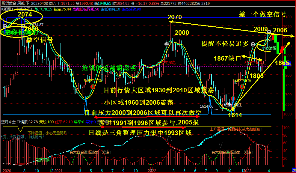 目前市场波动更多都是消息影响,周末欧佩克突然减产,同时芬兰加入北约今天,这个时候市场避险担忧俄罗斯会不会针对乌克兰一样的做法,即使没有北约和俄罗斯的对抗也会是经常存在,在有欧佩克现在也不听漂亮国使唤,你压低石油价格抑制俄罗斯,也影响其它产油国利益,你释放战略石油储备,在跌65你有没有补充,显然欧佩克不同意,减产继续推升石油价格,这样也是加大全球通胀上行经济衰退,昨日黄金来回洗盘最终上演过山车大涨,目前压力集中2000到2006区域最近2年在2000上几个没有出现三天以上时间,也就是说压力明显,每次触及2000上都是昙花一现最终上演冲高回落,本次上涨再次考验2000区域压力,那么能否一飞冲天中间关注1996得失,不要一日波动改变三观,熟悉盘面目前黄金银行避险拉升以后,现在日线三角整理形态,支撑1960区域压力1993区域。也就是说没有大阳或者大阴破位连续三天收盘其上下都是属于高位宽幅震荡,无厘头洗盘行情,昨日虽然强势上涨,但是依然没有突破1993区域,那么今日遇到1993到2000区域早盘依然继续做空,如果突破2006区域,那么就是在2015甚至2030再去中线择机布局,我们说了雷曼2008两房危机引发的避险拉升持续一个月高位横盘才回归技术,本次3月17日开启避险,那么要变盘也即是在4月17日前后,所以高位震荡还要保持2周,大区域1930到2010区域,小震荡1960到2000位置,那么今日操作就是很简单,先回落1975就是短多1968损目标1982到1990区域,如果直接反弹你早上1991到1996区域空2005损目标1975到1960到1945到1920到1900,如果这个单损了,那就是等2015甚至2030上在择机做空,也就是说不用着急,等多头动能衰退在进场。