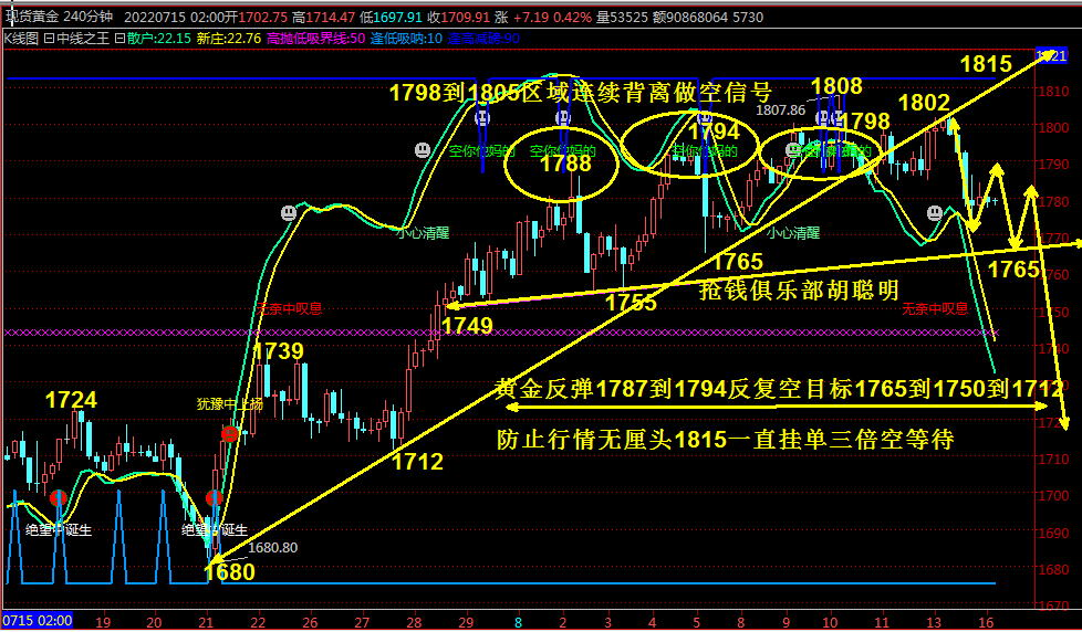 分时都是看到我们预期第一目标1765基本到位,关键在1765反弹最高1773区域,那说明今日压力依然是这里做空位置,这就是顶底转换,其实当出现做多信号五步完成,在出现做空信号基本幅度在50到80美金,基本在1808下调50到80美金就是1758到1728区域才能技术走完,目前看下面支撑基本成交密集区域在1740位置,既然行情连续三天破位下跌,又是期货交割周,那么空头继续控制盘面你要做的就是做空顺势就好。多余话不说随时关注我们等四小时出现做多信号,绝望诞生我们在去改变策略。综合上述操作思路如下:压力:1775----1796 支撑:1750----1720