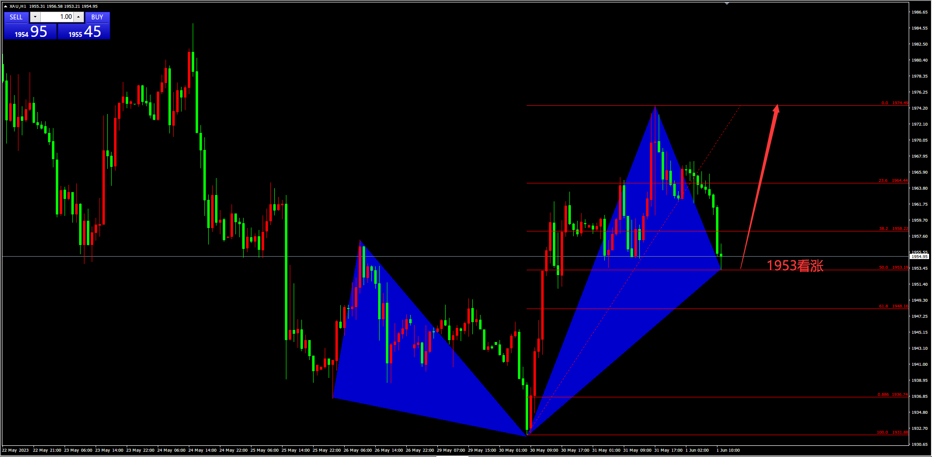 目前价格距离1953早间的交易计划价格相差不多,可以直接轻仓进场看后市价格表现。在这里是出现了一个教科书级别的看涨形态,当然这个也是当时就发了动态提醒的在百味财经上边。这个形态叫做暗箱看涨形态,要求比较严格,波段之间的关系。当然不能错过,所以直接参与了。其实这个形态第一目标就看前高1975附近。但是我比较保守止盈放在了1970.