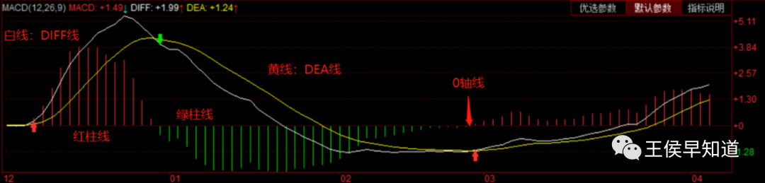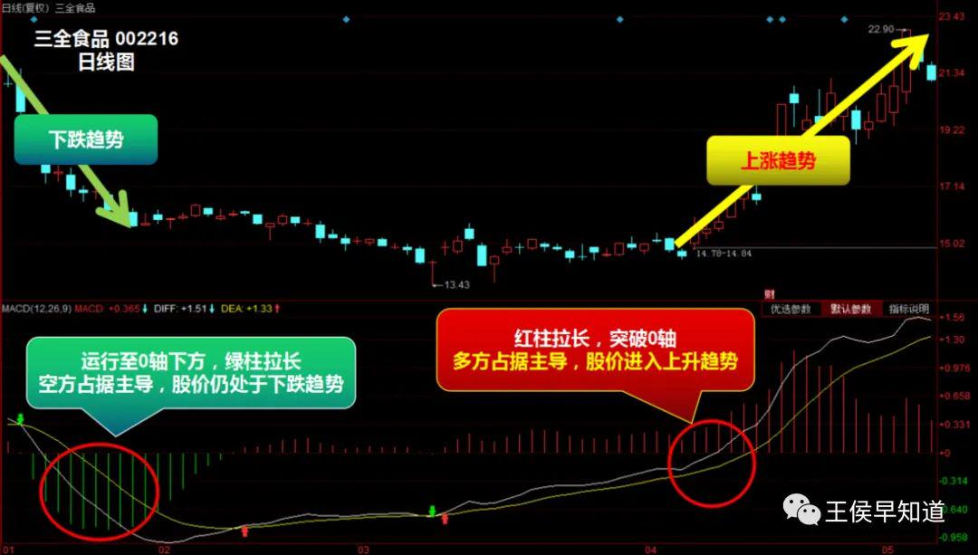 以三全食品为例,可以清楚的看到0轴和红绿柱的作用。0轴是多空力量强弱的分界线。MACD指标在柱线在0轴下方时,柱线不再拉长,而是开始逐渐变短,这说明空方虽然还是主导,但力量开始衰退。当MACD柱线由绿转红(由0轴下方升至0轴上方),意味着由空方主导转为多方主导,进入上涨趋势!