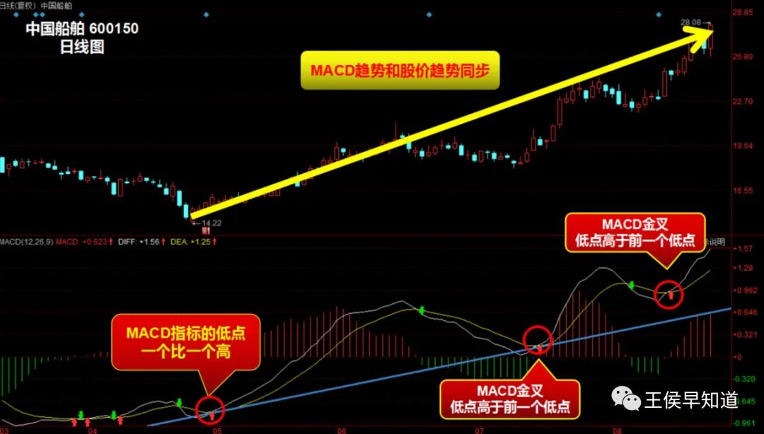 以中国船舶为例,该股自底部启动上涨,MACD指标也随着股价的震荡逐步走高。股价的回调的过程中,MACD指标回调的低点一个比一个高,说明股价处于上升趋势中,持股待涨方为上策。