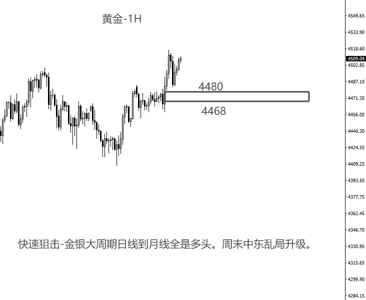 从目前金银的图形上看金价站住4500整数关口,临近前期历史高点而图形又表现出多头格局。加之周末的俄乌及中东乱局升级。这样下周1大概率金价还要进一步上行。那么明日早盘我们短线首先关注4480-4466这2个支撑位置。白银短线新高恐有难度。所以白银明日短线关注77.5的支撑位置。