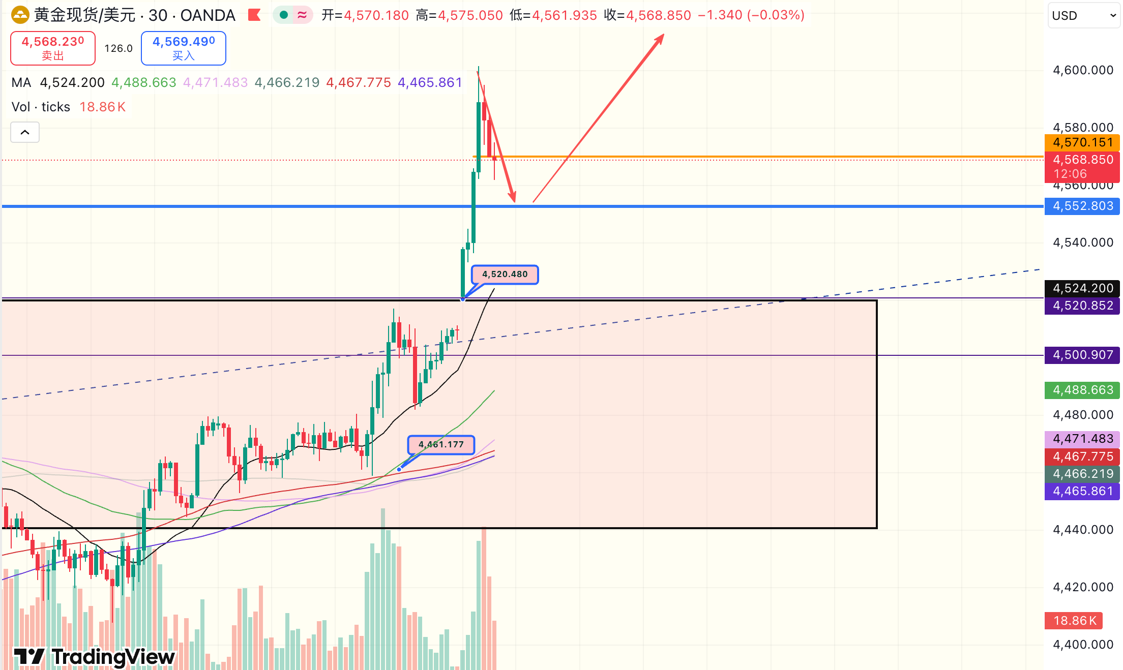 技术方面,今天的高开直接跳过上周震荡区间顶端4520,30分钟图表中可以看到MA20均线已经升至4524,表明短期支撑格外强劲,不过需要注意的是,自触及新高后成交量快速下落,回调风险骤升,下方我们先关注4552一线的支撑,上方压力位参考4650;关键点位在4570,再次有效突破后价格有望再创高峰。