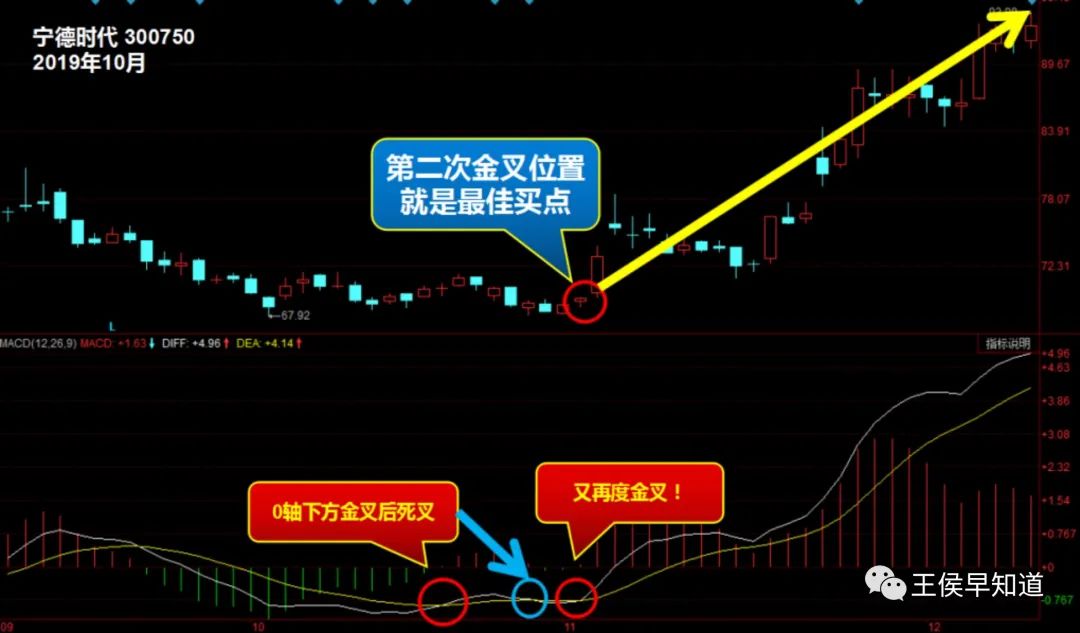 一起来看看宁王的例子,宁王的MACD指标在零轴之下出现二次金叉,形成小鸭出水形态。它表明上涨动能已经占据主导地位,股价接下来将出现一波上涨走势。当出现第二次金叉的位置,股票的合适买点出现!宁王自此开启一段长牛行情。