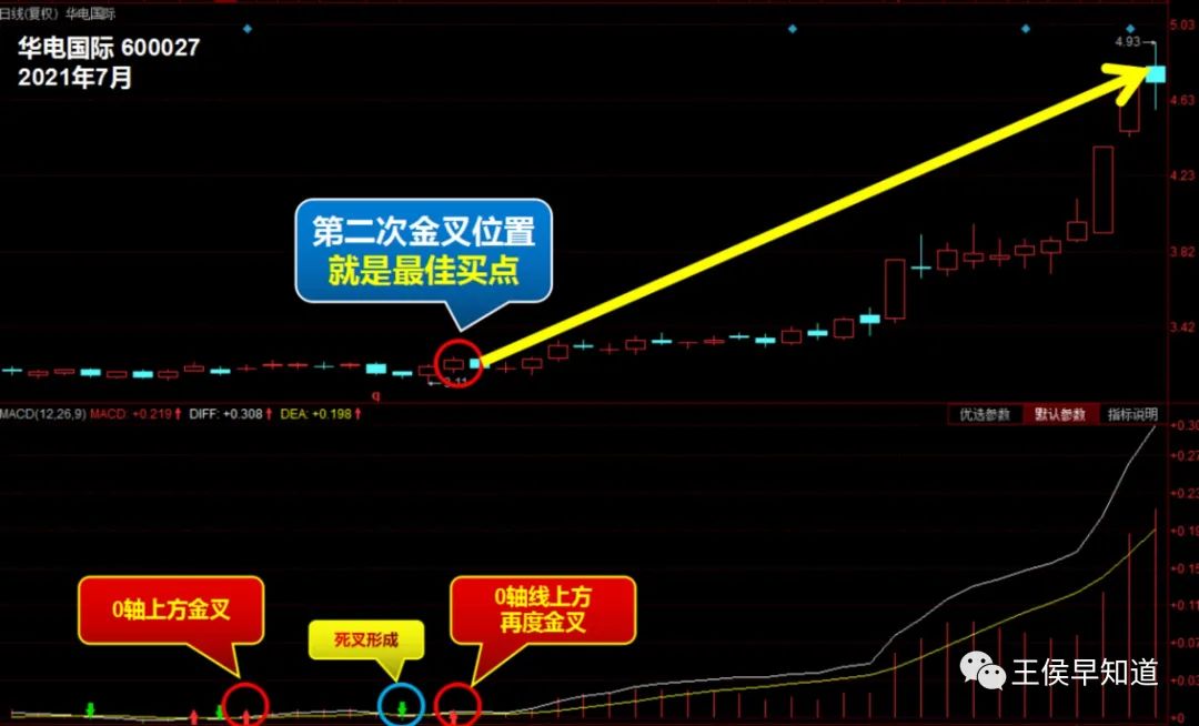 一起来看看华电国际的例子,了解如何在漫步青云形态中寻找合适买点。华电国际的MACD指标在零轴上方出现金叉,后又在0轴上方形成死叉,至此漫步青云形态形成!它表明上涨趋势在经过蓄势后将再度延续,通常上涨幅度不小。第二次金叉的位置就是积极买点信号。