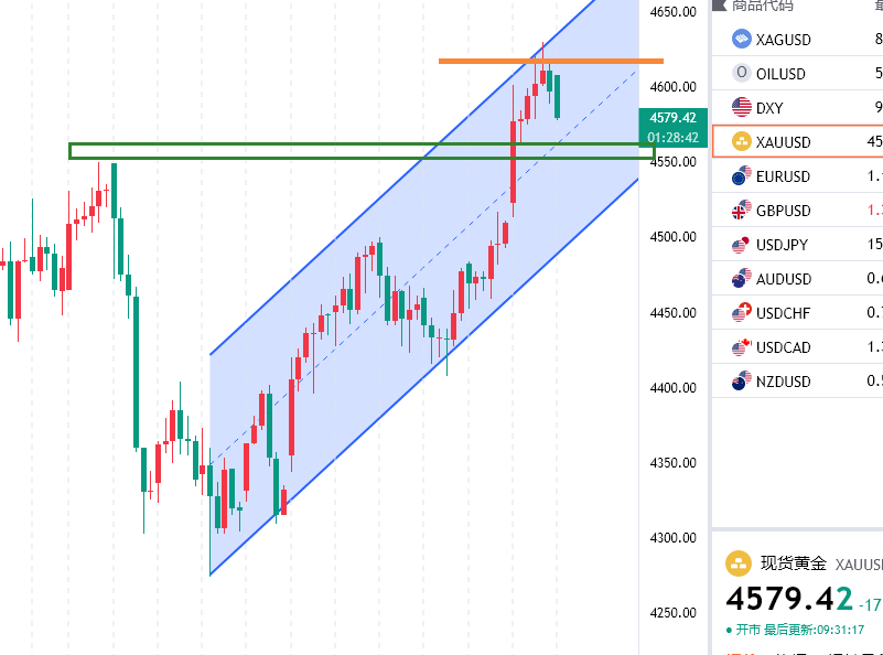 近期在全球地缘政治紧张的氛围中,避险再度成为了市场的主旋律,不断推动金银刷新着历史新高,另外一方面美联储主席鲍威尔面临刑事诉讼,旨在胁迫其改变美联储货币政策,这一举动让市场感受到了美联储独立性受到了威胁,然后会影响后续美元的强度从而改变全球的经济环境,黄金再度成了最好的归宿,上个交易日黄金高开高走一路上行,早盘一度在4600关口承压回落最低4561附近然后企稳继续走高,晚间跟大家分享回踩4576附近继续看新高,回踩最低4577一线如期拉高突破4600关口之后惯性拉伸触及4618附近然后回踩4588附近再度企稳晚间最高触及4630附近然后再度回落,早盘目前回踩4575附近维持高位震荡,操作上继续保持回踩接多,不追涨的思路,早盘在4600关口可以短空,下方关注4550附近分水岭支撑。