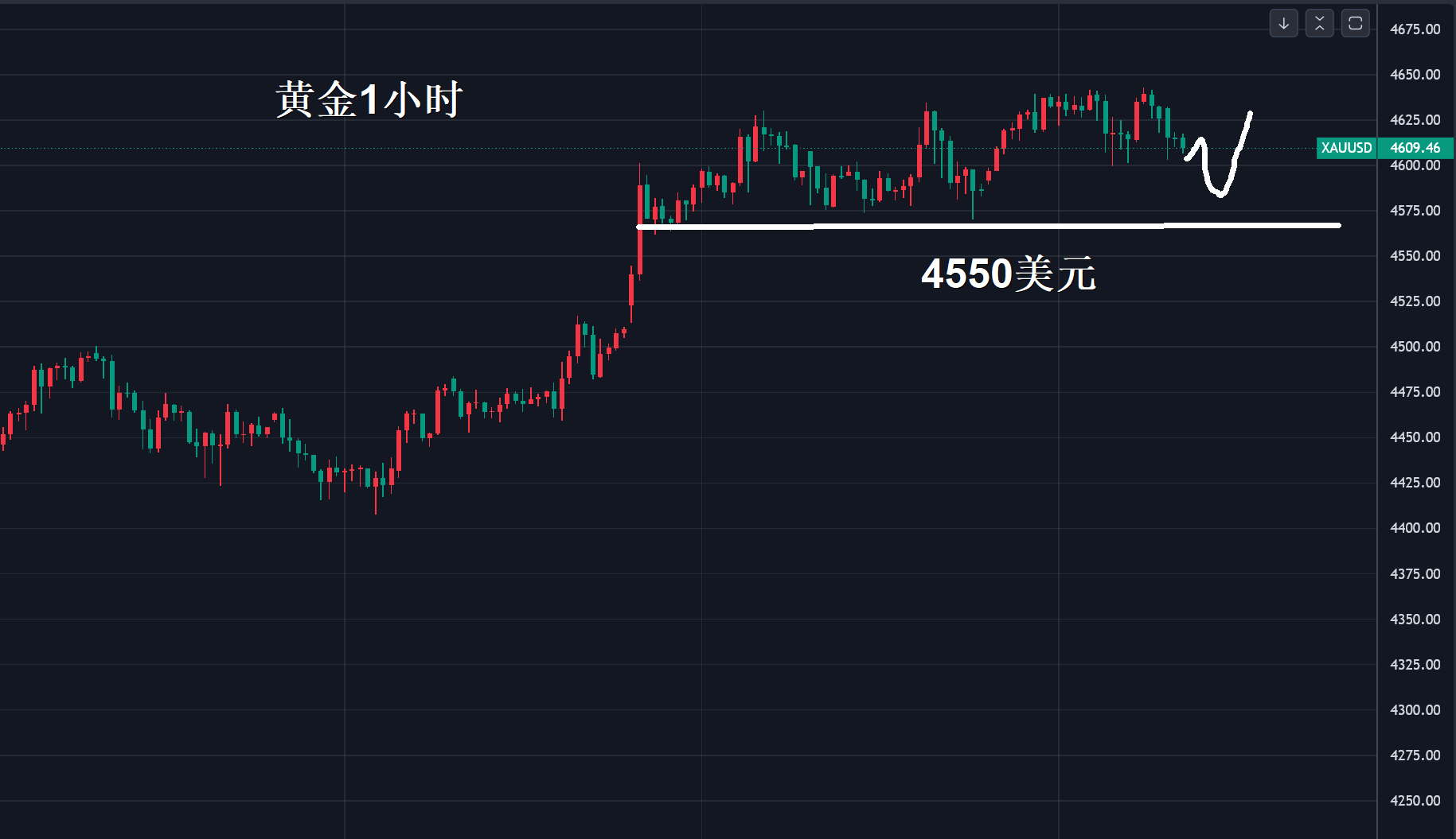 今天黄金回落后以4550美元为支撑点,以4650美元为压力位,靠近任意方向区间内操作,向下告诉就做多,向上告诉就空,以100美金内高抛吸低,突破后顺势跟进。