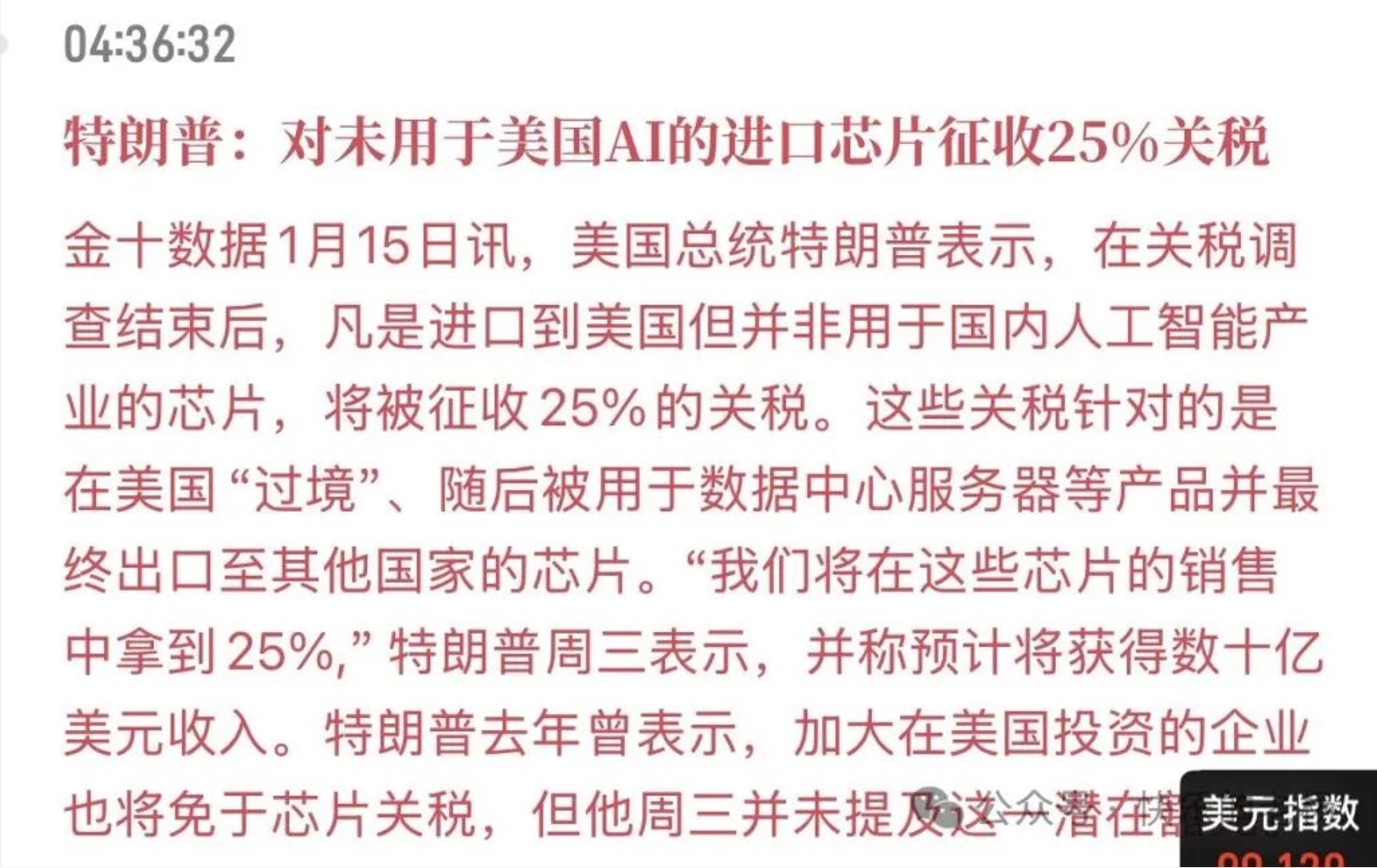 特朗普表示,对未用于美国AI的进口芯片征收25%关税。白宫发言人表示,近期或将扩大芯片进口关税范围。