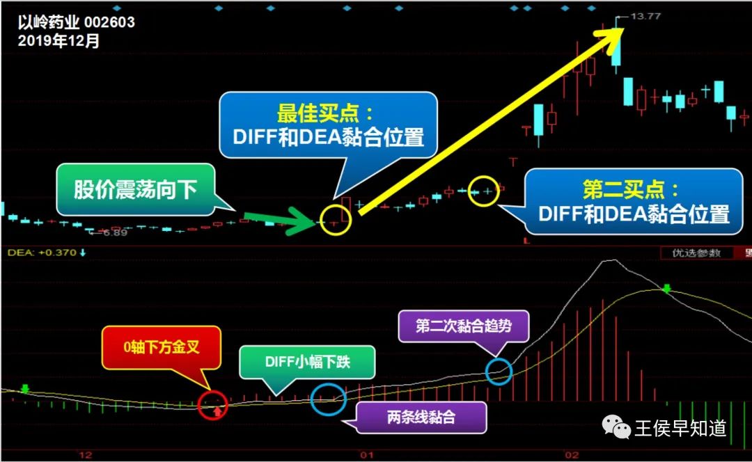 以岭药业的例子非常直观,两次黏合就是两次股票买点!空中缆绳形态是一种强烈的看涨信号。当零轴下方形成金叉,且DIFF线、DEA线顺利向上突破零轴是,表明市场上涨趋势基本成型。黏合表明市场正在积极蓄势,这个位置就会形成股票买点。之后DIFF线向上,表明上涨动能再度启动,股价将会出现一波较大的涨势。