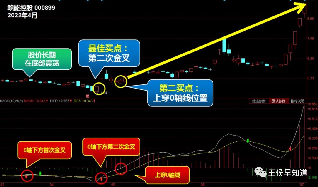 赣能控股就是标准的海底捞月形态案例。赣能控股的MACD指标在零轴下方出现二次金叉,形成海底捞月形态。表明市场筑底完成,股价很容易拉升。正如指标形态所示,股价走出一波强势表现。当二次金叉确立,就是最佳买点。当股价突破0轴也是合适的买点。