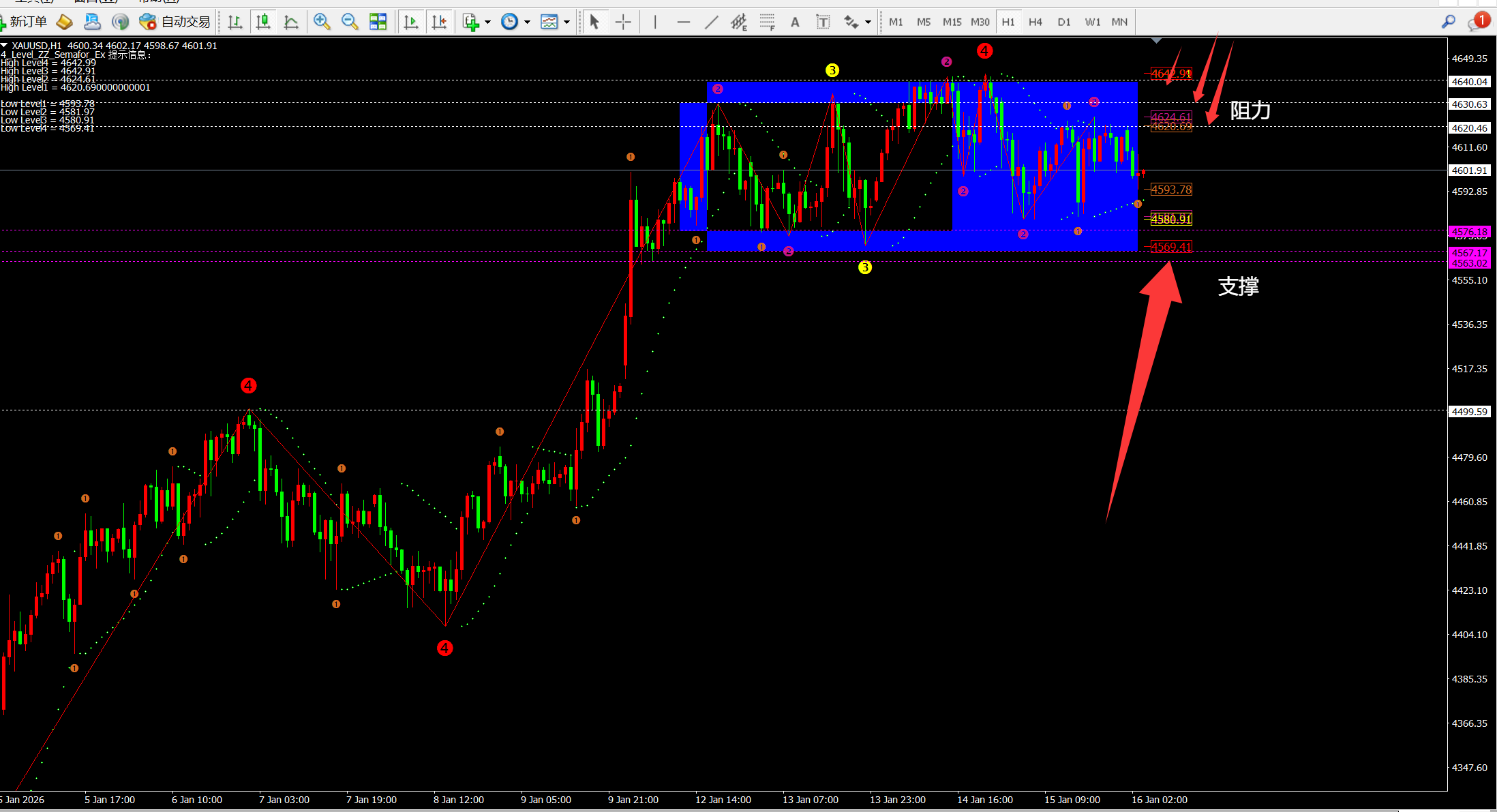 昨日黄金走势和天成分析的一样维持在打区间4570-4640区间一直震荡;昨日多次回踩4580附近未果反弹拉伸至4622附近再次下跌。