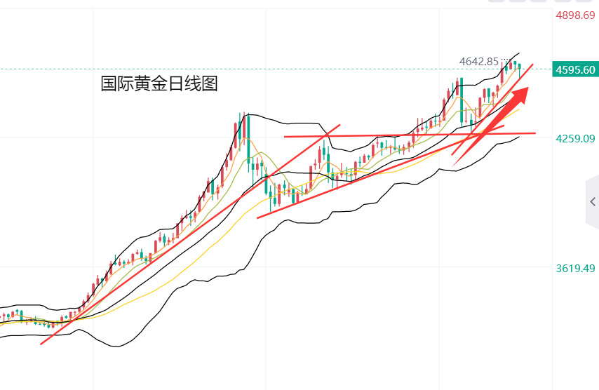 从之后的走势看,上周五亚欧盘中,黄金保持高位震荡,金价反弹4620美元遇阻,回落4591美元企稳,整体波动不大,美盘开盘,黄金回落4582企稳,反弹4620美元后,一波短线跳水急跌至4536美元,不过金价很快反抽至4600美元整数位置遇阻,此后基本保持4580到4600美元区间横盘。总体来看,黄金除了一波短线意外跳水反抽走势外,基本在我们给出的4580美元支撑上方保持震荡走势。