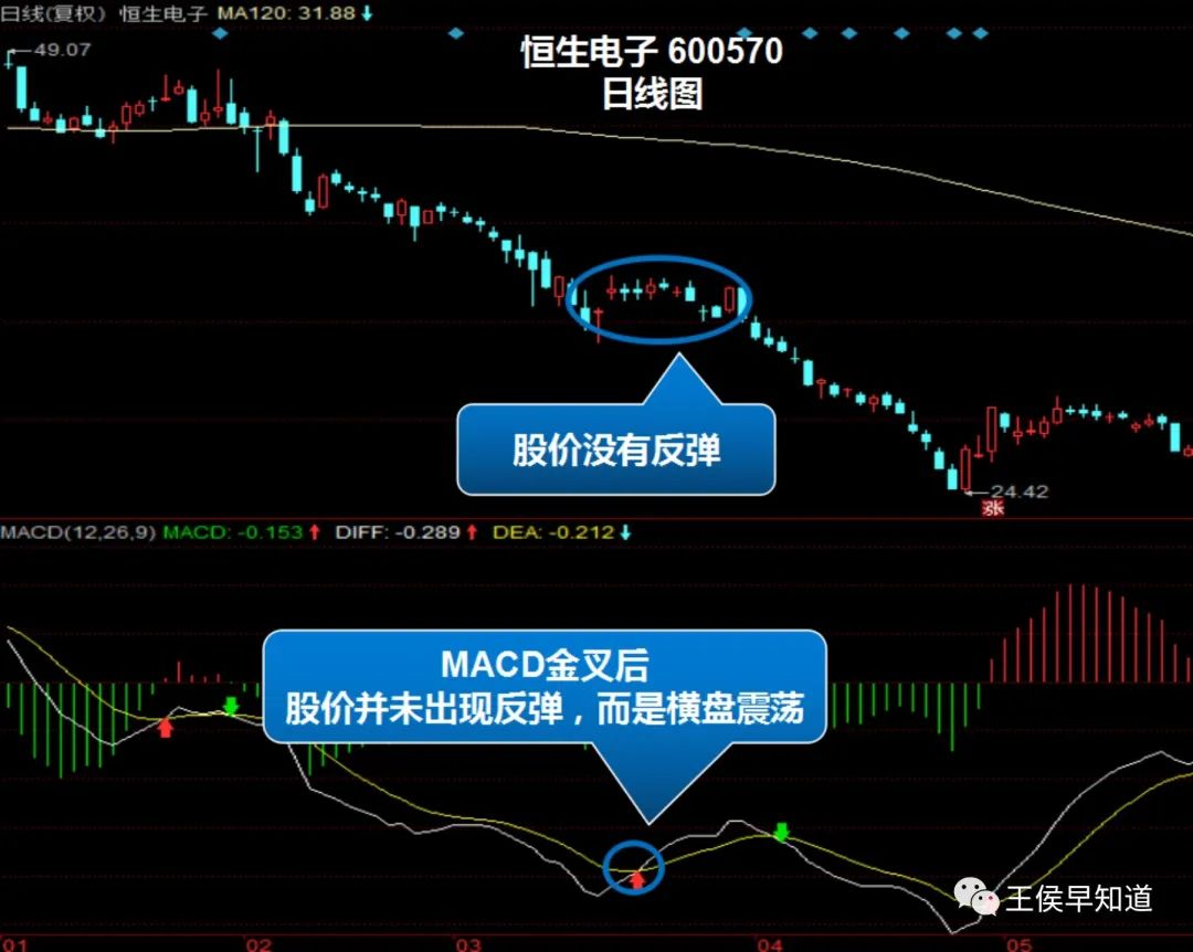 以恒生电子为例,在下跌趋势中MACD出现了金叉,企稳信号出现,股价有筑底的可能。反应在盘面上,股价确实开始横盘,一些朋友这时容易坐不住,萌生抄底或补仓的想法。MACD指标金叉后,股价短暂横盘,上方阻力很大,导致股价再度下跌。这边需要注意的是,如果下跌趋势中的金叉,需观察上方均线压力。如股价无法突破压力均线,同时也没有成交量的持续配合,这样的金叉往往都是金叉陷阱,需注意控制风险。