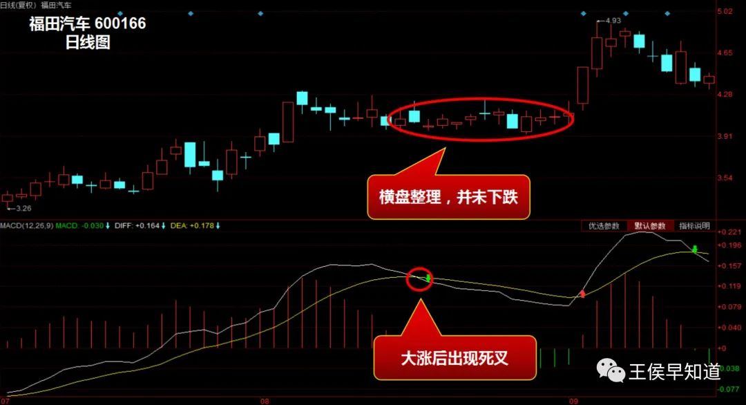 以福田汽车为例,股价前期成功脱离底部开始拉升,经过一波上涨后,为了有利于顺利加速拉升,对盘中的筹码进行充分的洗盘换手,以减轻上涨的阻力。在当时的高位形成死叉,容易导致不坚定的投资者卖出手上的筹码。虽然死叉,但股价并未下跌,横盘整理后,股价再度迎来一波强势拉升,这个就是死叉陷阱。当遇到MACD死叉,股价仅仅只是横盘整理时,就需要警惕死叉陷阱,持股待涨是较好的选择。