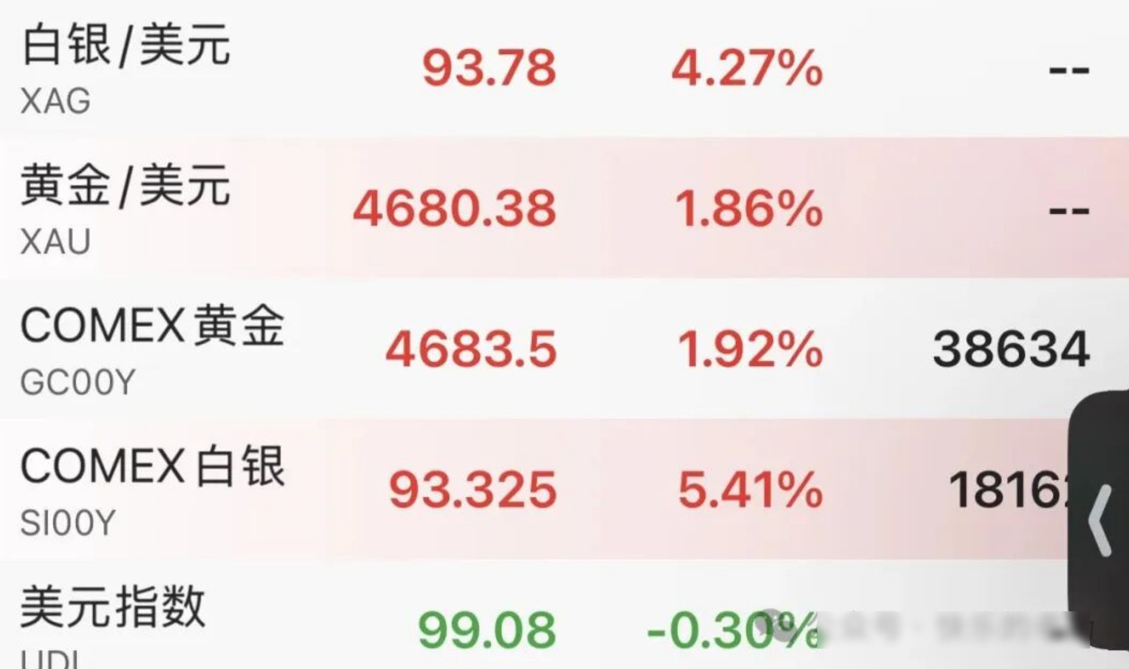 黄金白银而言,今天早盘高开后,黄金拿下4700美元应该轻松,本周如果局势继续紧张,4800也会很快到来,春节前5000美元值得期待。白银已经再次新高,100美元大关希望很大;年度120美元的目标确实保守了。不过,首次冲击100美元大关,依然提防大幅度回落的可能。