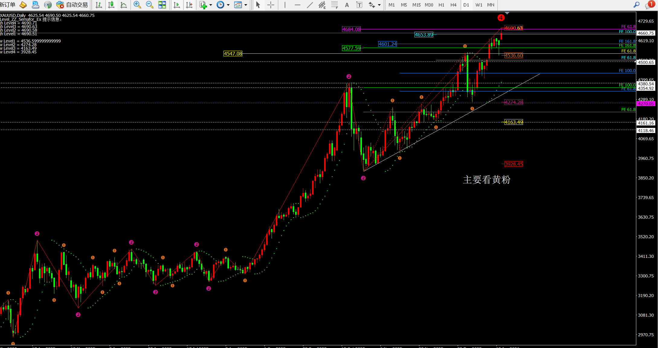 ① 周线指标macd金叉放量运行,灵动指标sto进入超买区域代表多头走势。目前支撑在均线MA5和均线MA10附近对应4526一线以及4375附近。目前周线布林带均线呈现多头排列因此我们做多就关注均线MA5支撑4526一线,防守就是均线MA10附近。