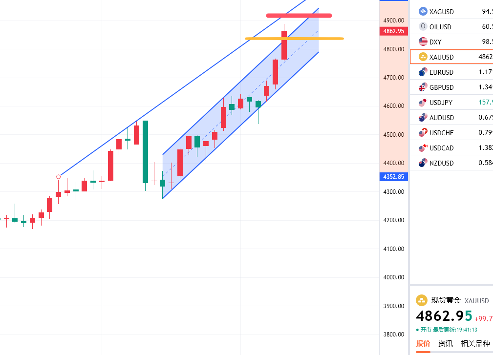 近期避险情绪再度席卷全球,以特朗普为中心,为了格陵兰岛的归属与欧盟展开强硬的关税战,欧盟目前态度强硬,然后伊朗形势严峻,加上俄乌目前持续的战火,综合来说就是地缘政治关系紧张,始作俑者主要还是美方,态度太过霸道,所以黄金也是再度进入了无脑上涨的局面,上不封顶,全是支撑没有压力,日内早盘开盘之后又是直接震荡走高,亚盘站上4800之后加速上涨,亚盘时段一度触及4649附近承压小幅回踩之后在欧盘二次拉伸最高触及4888一线然后走出一波快速回落到4832附近,然后再度回升,目前维持高位震荡,我们早盘跟大家分享的4840附近短空也是兑现到了4820下方第一目标位有20多点空间,没给多的机会,晚间关注4830/40一带强支撑,回踩接多依旧还是主旋律,只是高位谨慎追高,这种走势回踩起来幅度肯定也不会小。