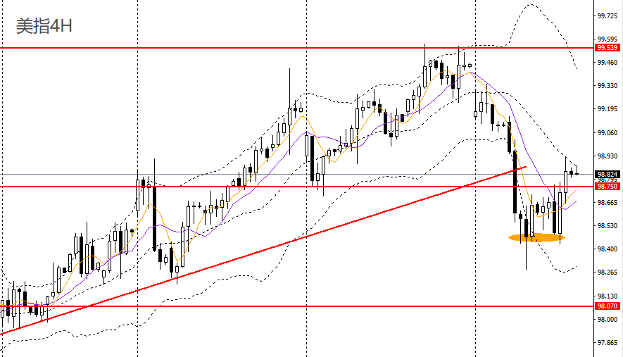 美元指数小幅反弹,日线RSI升至50左右,4小时呈双底,重新站上98.70一线阻力,短线趋势转强,如站上99关口,后市有望继续上探99.20,99.50。