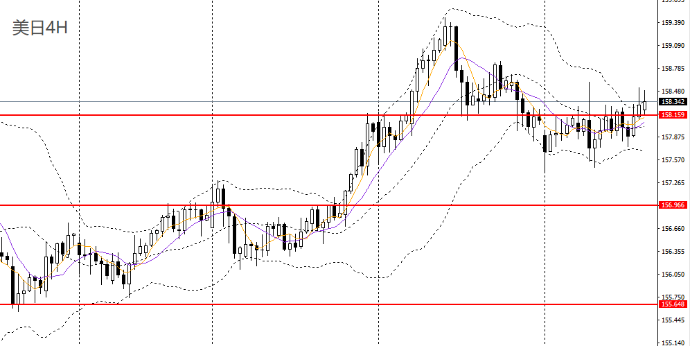 美日昨日再收十字阳线,日线RSI位于50上方,4小时守住157.50-157.70支撑带,呈头肩底,158附近企稳可进多,短线有望挑战159,159.40一线。