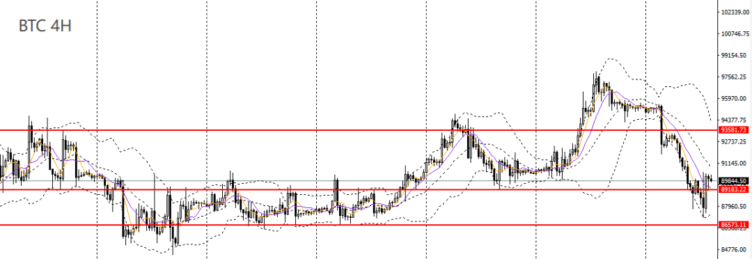 比特币收锤子阳线,一度逼近86000一线支撑,但4小时强势反弹,重回90000大关,90000仍为关键节点,如继续承压于下方,后市预计仍将回踩84000-86000一带,如重新站上,短线预计将再度挑战98000-100000。