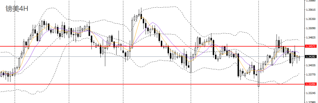镑美昨日收十字星,仍徘徊于5日、10日均线附近,4小时于1.3450一线遇阻回落,短线仍趋于震荡,可保持观望。