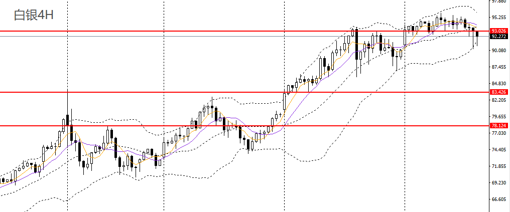 白银昨日阴跌,未破前高,失守5日均线,日线RSI小幅回落,4小时刺破91关口,短线强势转空,93一线承压可进空。
