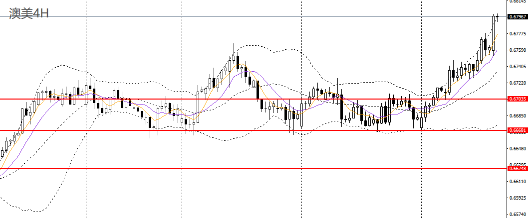 澳美日线呈前进三兵,站上日线布林上轨,今日亚盘延续涨势,创下一年多以来新高,短线走势在非美货币中可谓独树一帜,0.6770上方可继续寻找低多机会,后市预计将上探0.6820-0.6840。