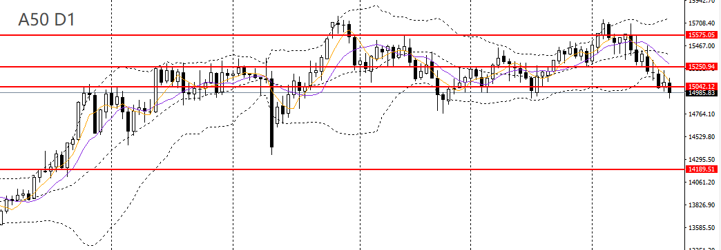 A50收十字阳线,今日亚盘拐头下行,日线RSI持续回落,4小时失守15000一线支撑,空单可继续持有,后市可下看至14800附近。