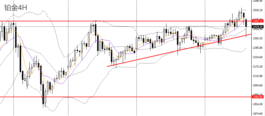 铂金收十字阳线,今日亚盘延续昨日美盘跌势,一度下破2400关口支撑,4小时回踩上行趋势线,2460附近承压可做空,下方首先关注2360-2370一带支撑。