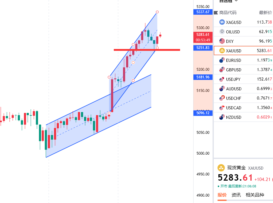 黄金日内保持强势格局,在避险以及美联储宽松预期的双重利好支持以及贵金属的强势共振一起推动下,黄金基本没有太多回踩的强势格局延续,早盘一路走高冲击5200关口后走出小幅回踩到5174附近再度强势走高,站稳5200之后基本就没有回头的走高,欧盘时段加速冲击上5300关口,触及5311附近跟周二的5110有异曲同工之妙,目前也是走出一波快速回踩到了5238附近,晚间的话关注5250附近支撑低多,有靠近5300附近位置可以考虑做空一次看看调整,有来有回的行情才是正常的市场表现!