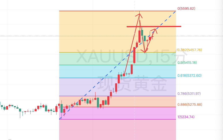 早间开盘,黄金又是一路高歌,30分钟涨了180美金,逼近5600美金的大关,随后半小时又暴跌140美金,行情波动是又快又猛.现在的行情,上方已经找不到阻力位,而早间的回落,就需要找机会做多,而下方支撑,关注昨晚美盘低点5236到早间高点上涨回撤到382支撑5457,早间黄金,可以依托此支撑看二次上升,上方阻力看早间回撤反抽的618压力位5542,金价若能有效突破此压力,午后有望继续走高.操作思路上,5457附近多,止损5447,看5400-40.